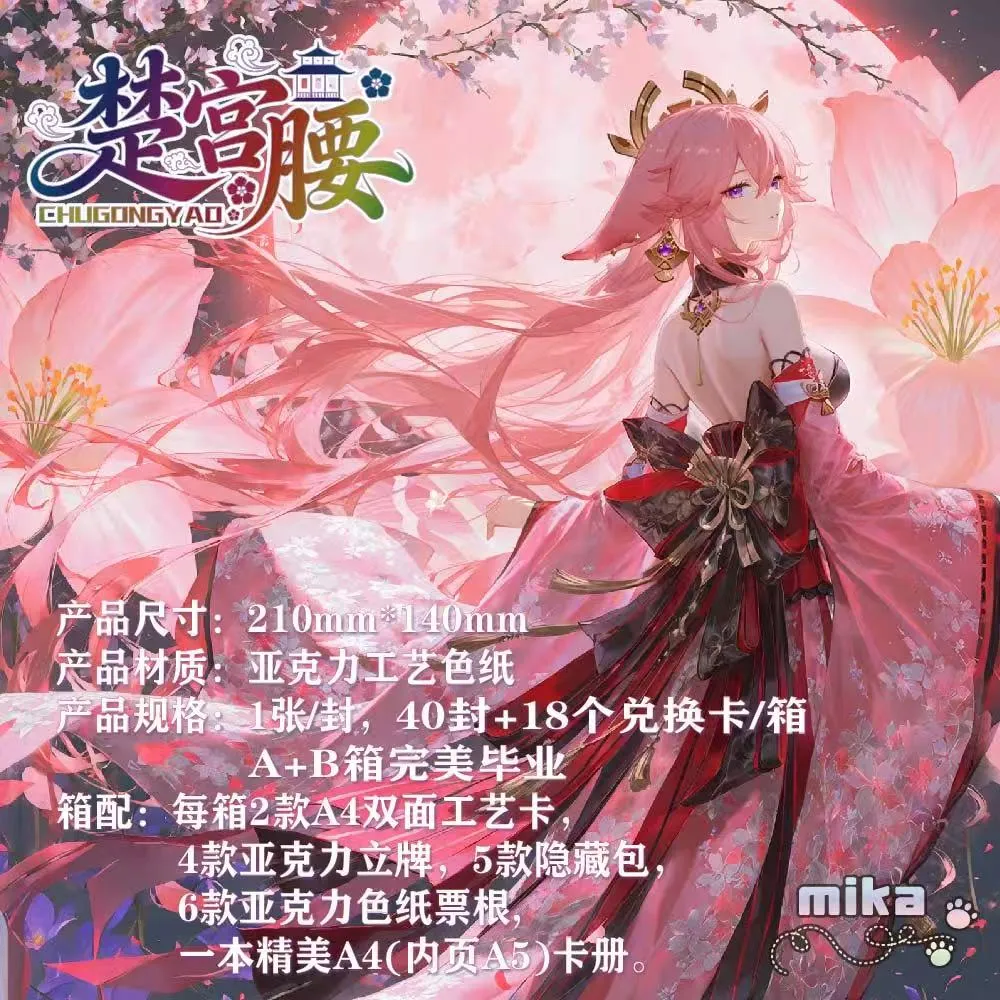 Discover the intriguing Chugongyao, a unique card collection that offers a mystery-packed experience. Each box contains 1 A5-sized cards, perfect for collectors and enthusiasts alike. The larger card size allows for more details to be seen and appreciated. This set, known in Chinese as 楚宫腰, comes from mika, offering quality craftsmanship by mika.